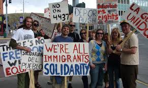 II. Las gloriosas manos de los inmigrantes han construido las bases del mundo, según las Naciones Unidas hay mas de 200 millones de inmigrantes en el mundo, solo en EE.UU hay unos 30 millones, de ellos 20 millones son hispanos, 12 millones son indocumentados. En un día como hoy estamos en las calles de esta gran nación para decirle a los norte americanos que estamos aquí, para decirles a las autoridades pertinentes, que somos los que construimos sus casas, mansiones, que sembramos y cosechamos lo que esta en sus mesas cada día, que hacemos los peores trabajos y los menos remunerados.
