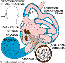 El llamado vértigo posicional paroxístico benigno (VPPB) es el tipo más frecuente de vértigo. Se debe a una relocalización del grupo de cristales de calcio (conocidos en conjunto con el nombre de otoconia), que en condiciones normales se hallan en la utrícula del oído interno y que, por alguna razón, salen de su posición original y migran, con el tiempo, hacia uno de los canales semicirculares (por lo general hacia el canal posterior, debido a su posición anatómica). Cuando la cabeza gira (en particular cuando el cuerpo se coloca en decúbito), el cambio de su orientación respecto a la dirección de la fuerza de gravedad provoca un movimiento de los cristales más pesados, lo que causa un desplazamiento anormal del fluido interno del canal (la llamada endolinfa) y, por consiguiente, la sensación súbita de vértigo. La sensación surge sin que haya complicaciones adicionales.